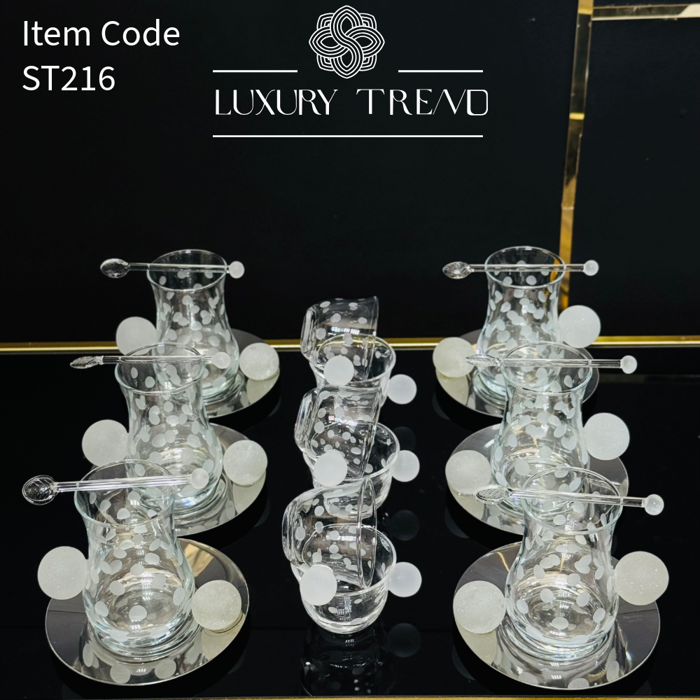 طقم استيكانات تركي الصنع مع اضافة الحفر اليدوي على الزجاج ليضيف لمسة فخمة على الطقم  الطقم يتكون من ست استيكانات شاي مع ست صحون ستانلس سيلفر و ست فناجين قهوة وست ملاعق