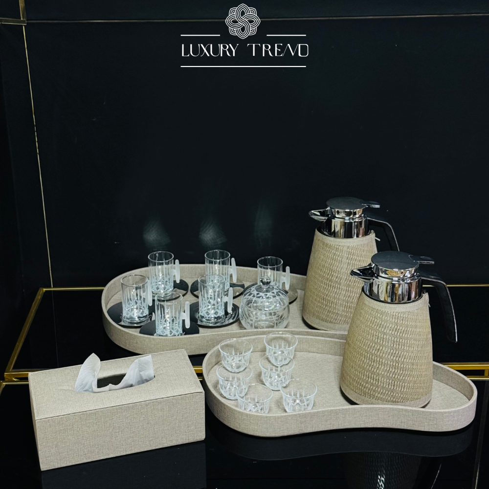 طقم ضيافة وتقديم كامل ، مناسب للهدايا ، ليضيف للمجلس لمسة مميزة ، مكونات الطقم : صينية جلد صغيرة ، صينية جلد كبيرة ، طقم ستيكانات وفناجين تركي ، طقم دلات ، سكرية ، علبة مناديل