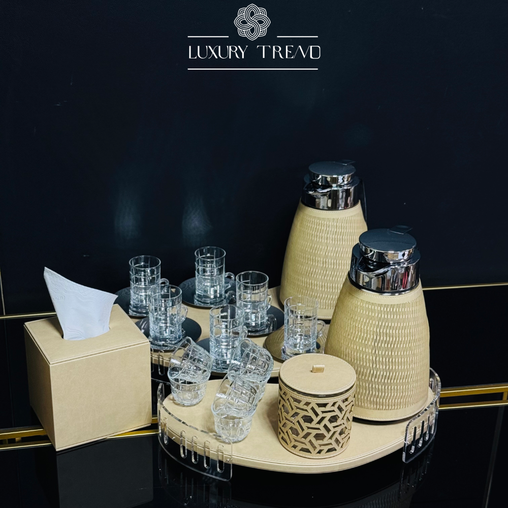 طقم ضيافة وتقديم كامل ، مناسب للهدايا ، ليضيف للمجلس لمسة مميزة ، مكونات الطقم : صينية جلد صغيرة ، صينية جلد كبيرة ، طقم ستيكانات وفناجين تركي ، طقم دلات ، سكرية ، علبة مناديل